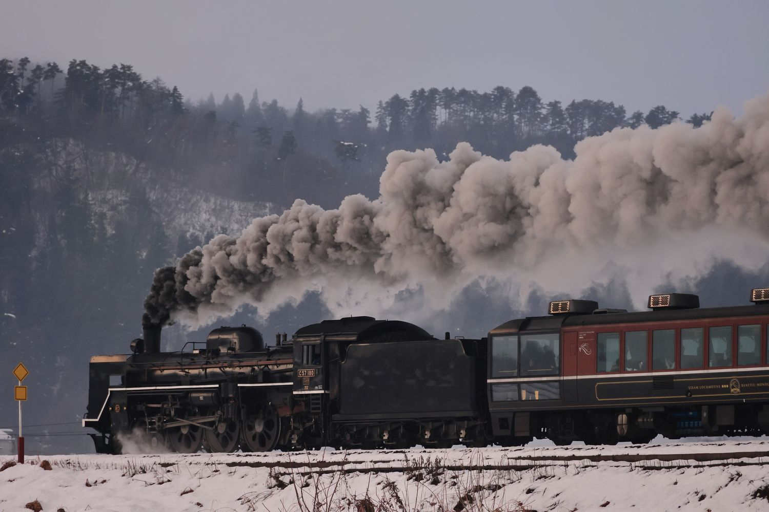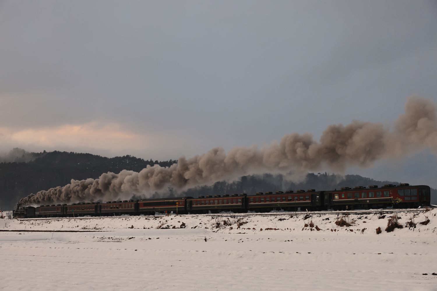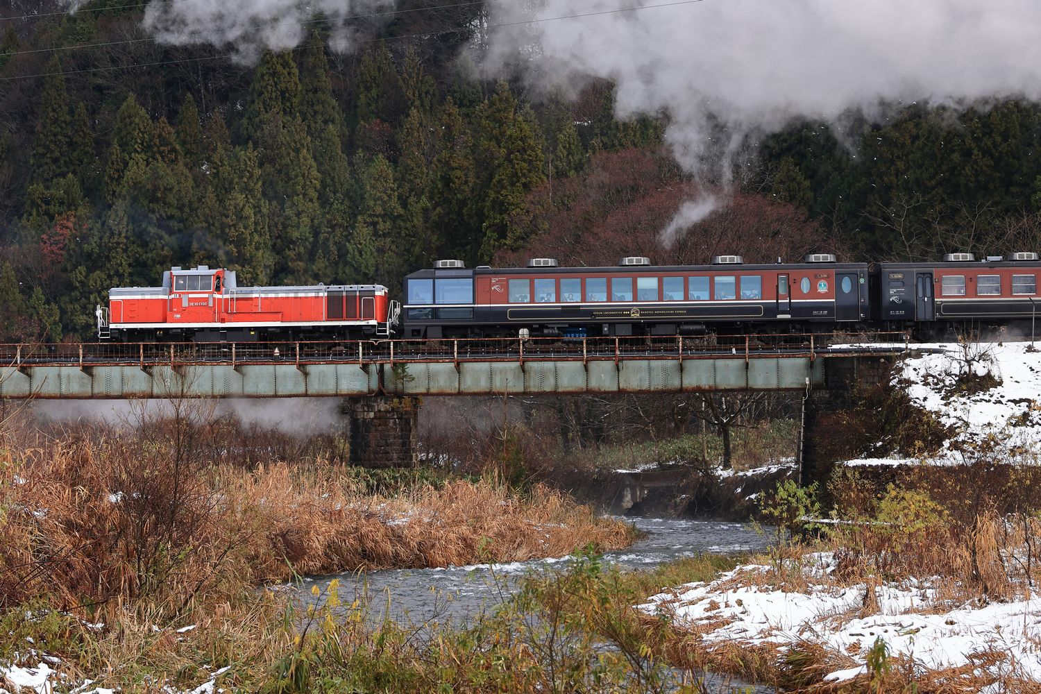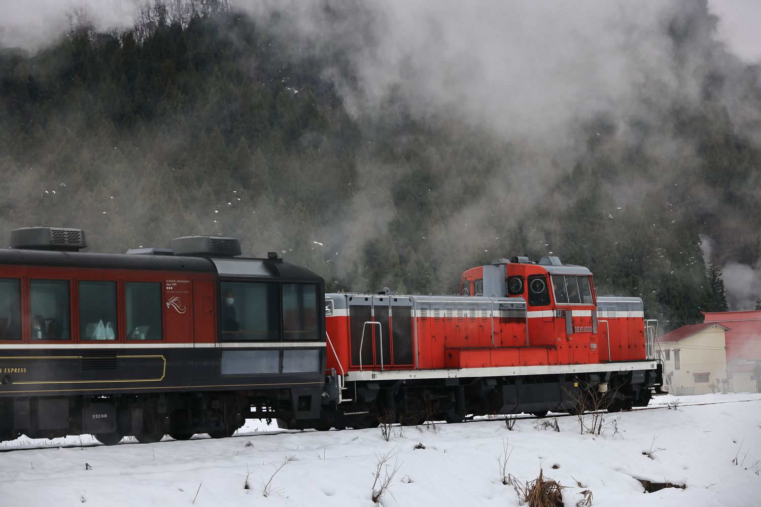 | 天気は曇り⇒小雨 本日も先輩のお気に入りポイントからスタートします ここは本年度5回目 先月からDE10 1700が最後尾に連結 |