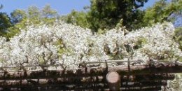 下り藤   「藤は日本の山野にふるくから自生していたらしく、マメ科のつる性植物として、いまでも藤棚などにからませて鑑賞する。たれさがるうす紫の蝶形の花群は、じつに美しい。・・・・・はじめて文献にみられるのは『古事記』で、花衣の伝説としても有名である。この花が、古代人にもきわめて美しく映じたからであろう。」