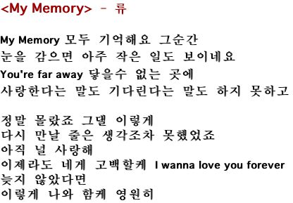 ♪My Memory♪ - リュウ My memory すべて憶えているよ。 You're far away 手の届かないところに *今でも信じられない あなたとこんな風に再び逢えるなんて たくさんの時が流れても どんなに遠く離れていても * |