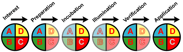 - 検証:知的プロセスをβ波の状態に戻し、時々午前2時に、またはシャワーを浴びているとき、あるいは通勤途中に起こる。これは可能な解決策を本来の問題との関係で評価する段階で、一般的に高い周波数のβ波である。