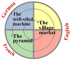 - 独のビジネス文化は、十分に潤滑油のきいた機械、仏はピラミッドのようであり、英国は村の市場に似ている。