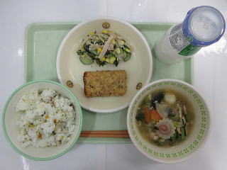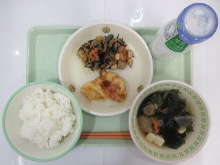 ![]() ご飯 とり天 大豆の五目磯煮 つみれ汁 牛乳 |