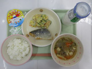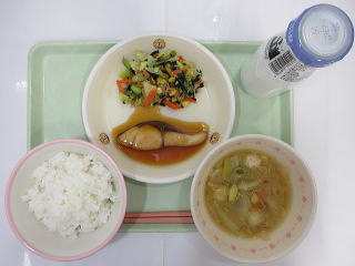 ![]() ごはん いなだのてりやき ひじきサラダ みそちゃんこじる ぎゅうにゅう |