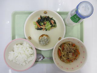 ![]() やきんくどん (ごはん やきにくどんのぐ) にらまんじゅう わかめサラダ ぎゅうにゅう |