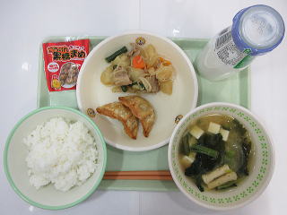 ![]() ご飯 肉じゃが さばカレーぎょうざ 玉ねぎとわかめのみそ汁 黒糖ビーンズ 牛乳 |
