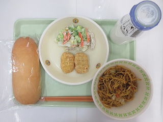 ![]() セルフ焼きそばパン (コッペパン ソース焼きそば) チキンナゲット 花野菜サラダ 牛乳 |