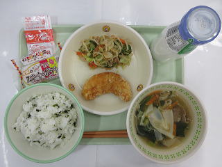 ![]() ごはん まめまめサラダ いわしあげだまフライ みそキムチスープ ぎゅうにゅう |