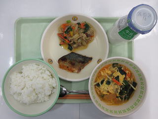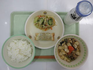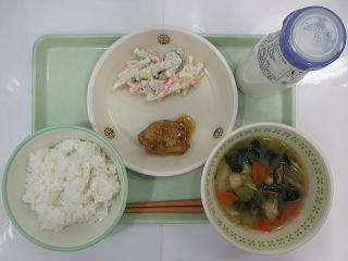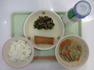 ![]() ごはん あじあげに やきにくサラダ とりにくとはくさいのみそしる ぎゅうにゅう |