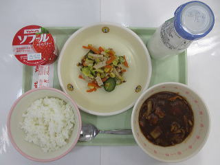 ![]() ひよこ豆とひき肉のスパイスカレー (ご飯 スパイスカレー) ツナとひじきサラダ 一口ピーチゼリー 牛乳 |