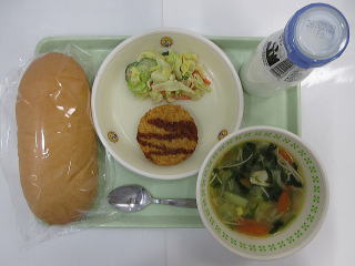 ![]() コッペパン 豚肉入りコロッケ キャベツとツナのサラダ ABCマカロニスープ 牛乳 |