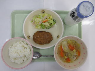 ![]() ごはん ラビオリスープ ハンバーグガーリックオニオンソース コールスローサラダ ぎゅうにゅう |