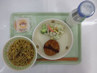 ![]() いか入り焼きそば キャベツメンチカツ 花野菜サラダ 焼きプリンタルト 牛乳 |