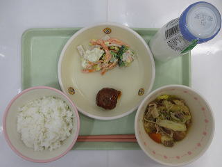 ![]() ごはん ビッグにくだんご はなやさいサラダ すきやきふうに ぎゅうにゅう |