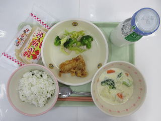 ![]() わかめごはん からあげ はるさめサラダ ABCマカロニスープ ガトーショコラ ぎゅうにゅう ミルメークコーヒー味 |