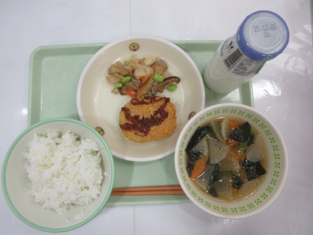 ![]() ご飯 いももち汁 ハンバーグおろしソース 切り昆布のうま煮 牛乳 |