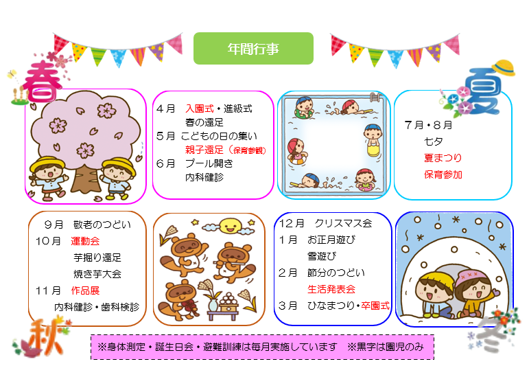 ☆保育参加…0、1歳児クラスの新入園の方が対象。平日の午前、保護者の方が保育に参加します。