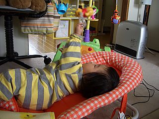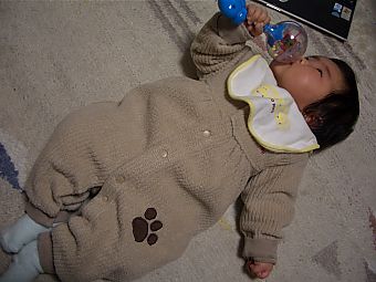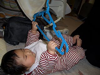 ちょっと手助けしてあげれば、簡単に寝返りが うてるようになりました。あとちょっとだね。 その日にそなえて、ハンガーで特訓だ! |