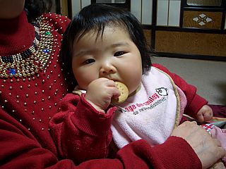 大人の食べる姿をじーっと見ているので、おせんべいを あげてみました。 なかなかおいしそうにたべています。 明日は、よいよ能登のばーばとお別れです。今度会うのは 8月(お祭り)だね。それまで、元気でいてね。 |