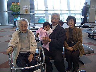 今日はお別れの日。みんな佐賀空港までお見送りしてくれました。 また遊びに来るので、元気でまっててください。 パパとは久しぶりの再会です。 ちょっと忘れていたようですが、すぐに思い出したようです。 ニコニコ顔で、パパに抱っこされています。 |